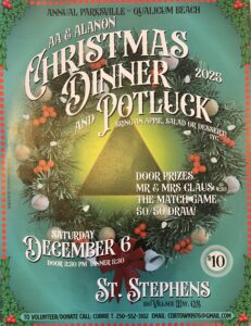 December 6th Doors:3:30pm Dinner: 5:30pm Location: St. Stephens 150 Wallace Way, Qualicum Beach