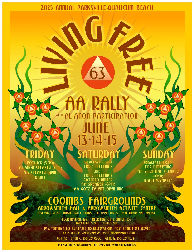 Our annual A.A. Rally with Al-Anon participation at the Coombs Fairgrounds. A country/rustic feel in the heart of Coombs (near